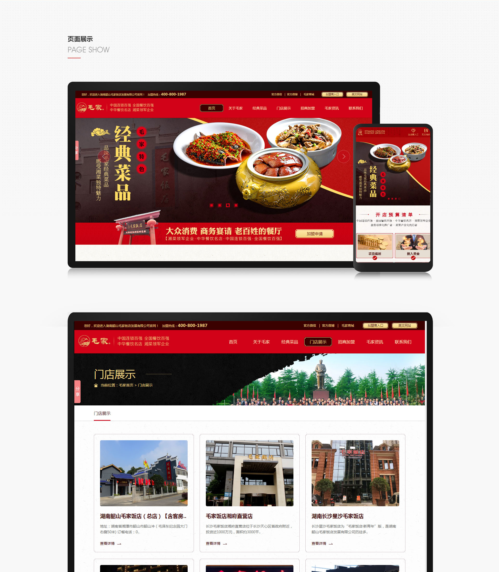 風格上,采用的簡約中國風,將紅色文化與餐飲結(jié)合,同時融入輕質(zhì)感背景,傳統(tǒng)窗格邊框與紋路,把毛家特色體現(xiàn)出來