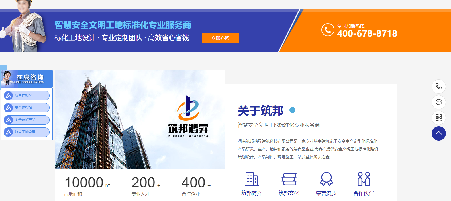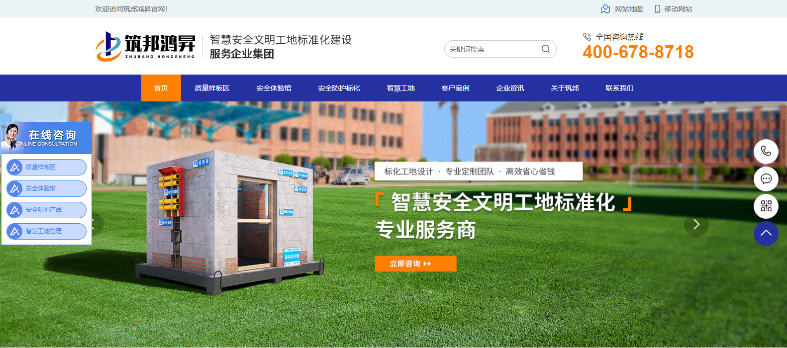 網站主欄目:首頁、質量樣板區、安全體驗館、安全防護標化、智慧工地、客戶案例、企業資訊、關于筑邦、聯系我們