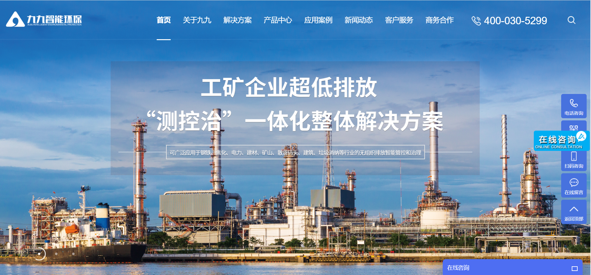 湖南九九智能環保股份有限公司(簡稱九九智能環保),是專業從事大氣污染監測、控制、防治技術研究與應用,為超低排放治理領域提供環評診斷、設計開發、產品制造、設備集成、工程建設、檢驗檢測、運營維護等全產業鏈總集成總承包服務的國家專精特新重點“小巨人”企業。公司主要產品有云霧抑塵系統、單雙流體云霧抑塵系統、微霧型智能遠程霧炮機、智能洗車機、智能霧樁、移動式負壓除塵車、袋式除塵器、新風置換降塵系統、粉塵監測儀、VOCs監測儀、 VOCs治理裝備、清潔運輸門禁系統、環保測控治一體化智能平臺等。在"碳達峰"、"碳中和"的全球大背景下,工業企業如何實現超低排放,綠色生產,是當前我國環境治理的重要課題。九九智能環保自主研發的"工礦企業超低排放智能解決方案"正是順應這一迫切需求,從污染源的監、管、治入手,融合檢測傳感、機器視覺、通訊物聯、大數據分析等多項前沿科技,通過多技術整合、多傳感布局、多設備協同、多系統集成,形成了一整套超低排放的智能化解決方案,廣泛適用于鋼鐵、焦化、礦山、水泥、電力、建筑等行業。該解決方案的應用,可實現污染源網格化監測、智能化控制、精準化治理的完整閉環,從而滿足企業環保要求,達到超低排放標準。