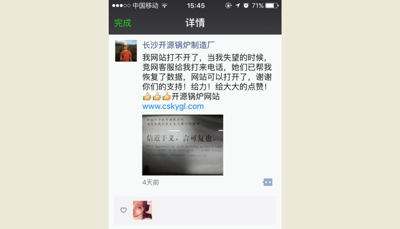 長沙開源鍋爐制造廠王先生在朋友圈里發了一條消息,連聲稱感謝競網的幫助,網站可以打開了!這究竟是什么回事呢?