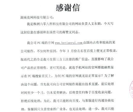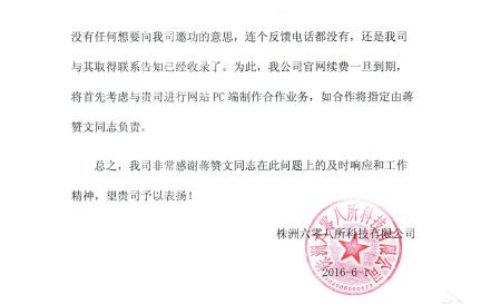 近日,競網建站收到了一封來自株洲六零八所科技有限公司的感謝信,在信中客戶表示“(蔣贊文)果真是高手,而且是高手中還有這么為客戶著想的工作態度,品行能力一等一”,那么客服蔣贊文究竟做了什么,讓客戶寫了長達三頁的感謝信呢?