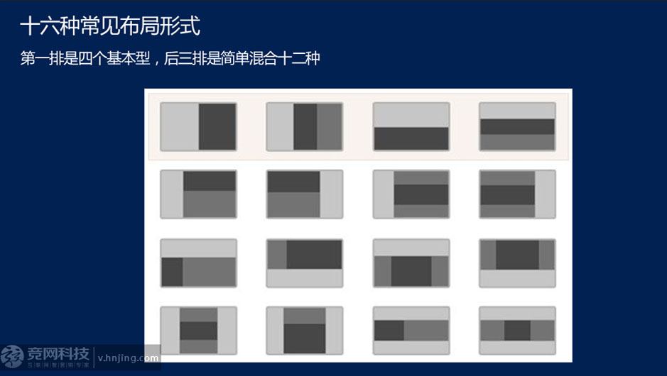 十六種常見(jiàn)布局形式:第一排是四個(gè)基本型,后三排是簡(jiǎn)單混合十二種 。