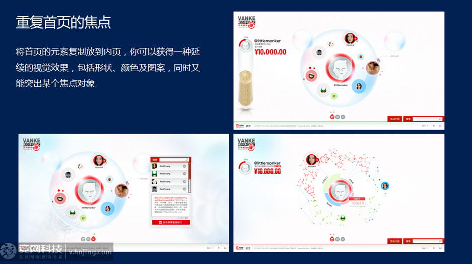 重復(fù)首頁(yè)的焦點(diǎn) : 將首頁(yè)的元素復(fù)制到內(nèi)頁(yè),你可以獲得一種延續(xù)的視覺(jué)效果,包括形狀、顏色及圖案,同時(shí)又能突出某個(gè)焦點(diǎn)對(duì)象。