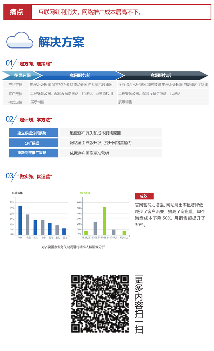 2004 年,多靈環(huán)保開始觸網(wǎng),逐漸從一家僅 3 人的小作坊轉型成為一個行業(yè)排名前三的制造企業(yè),90% 以上的新客戶來源于互聯(lián)網(wǎng)。2015 年開始,互聯(lián)網(wǎng)紅利逐漸消失,企業(yè)對線上流量的爭奪越來越激烈。在制造行業(yè)整體疲軟、同行競爭激烈的情況下,多靈環(huán)保升級互聯(lián)網(wǎng)營銷系統(tǒng),業(yè)績逆勢上揚,產(chǎn)品供不應求,遠銷加拿大、澳大利亞、韓國等國。