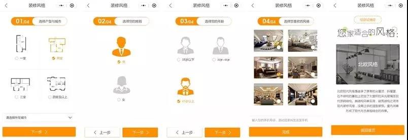 按照四個步驟,第一步選擇戶型、城市;第二步選擇性別;第三步選擇年齡;第四步選擇風格、輸入手機號碼提交,輸出風格測試結果。