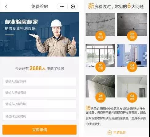 輸入稱呼、手機號碼、小區名稱、驗房時間,獲取免費驗房,主要檢測裂縫、電路、門窗、外漏、漏水、隱患等。