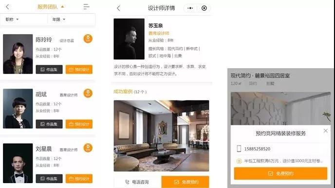按照級別展示設計師,可微信/電話預約設計服務。