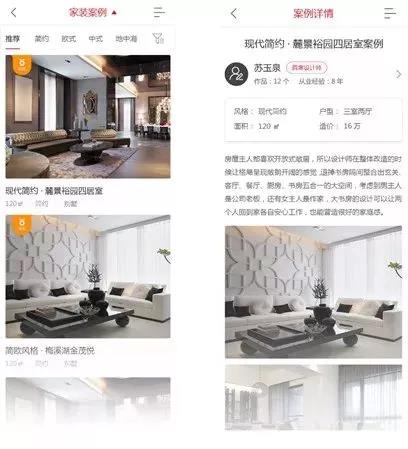 按照風格、戶型、面積來篩選案例,圖片進行輪播展示,可以關聯對應的設計師,可微信/電話預約設計服務。