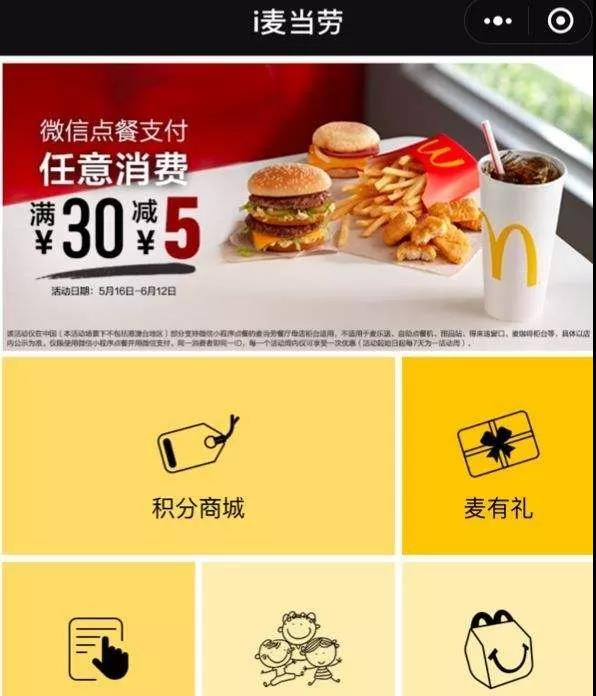例如,麥當勞使用積分兌換來提高用戶粘性。麥當勞小程序本身就具有品牌優(yōu)勢,自然是市場上使用次數(shù)較高的一款餐飲類小程序。