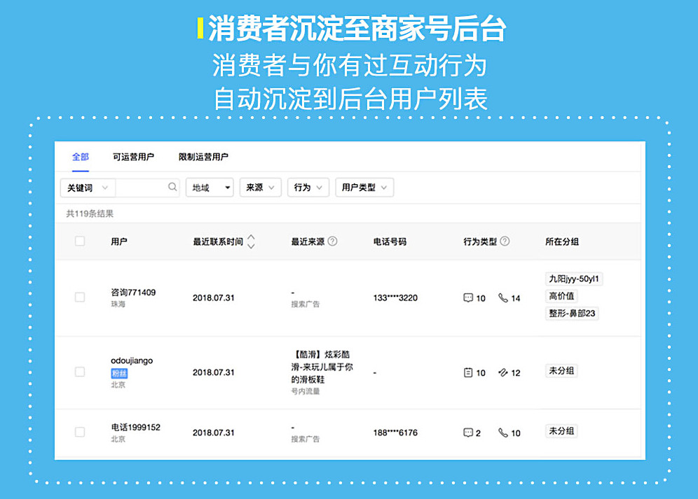 用戶只要與商家產生了交互行為,即電話、咨詢、表單、關注熊掌號等,用戶即會自動沉淀到商家號后臺用戶列表,在交互行為中斷后,廣告主可以通過手百推送消息喚醒用戶,重新與用戶建立對話連接。