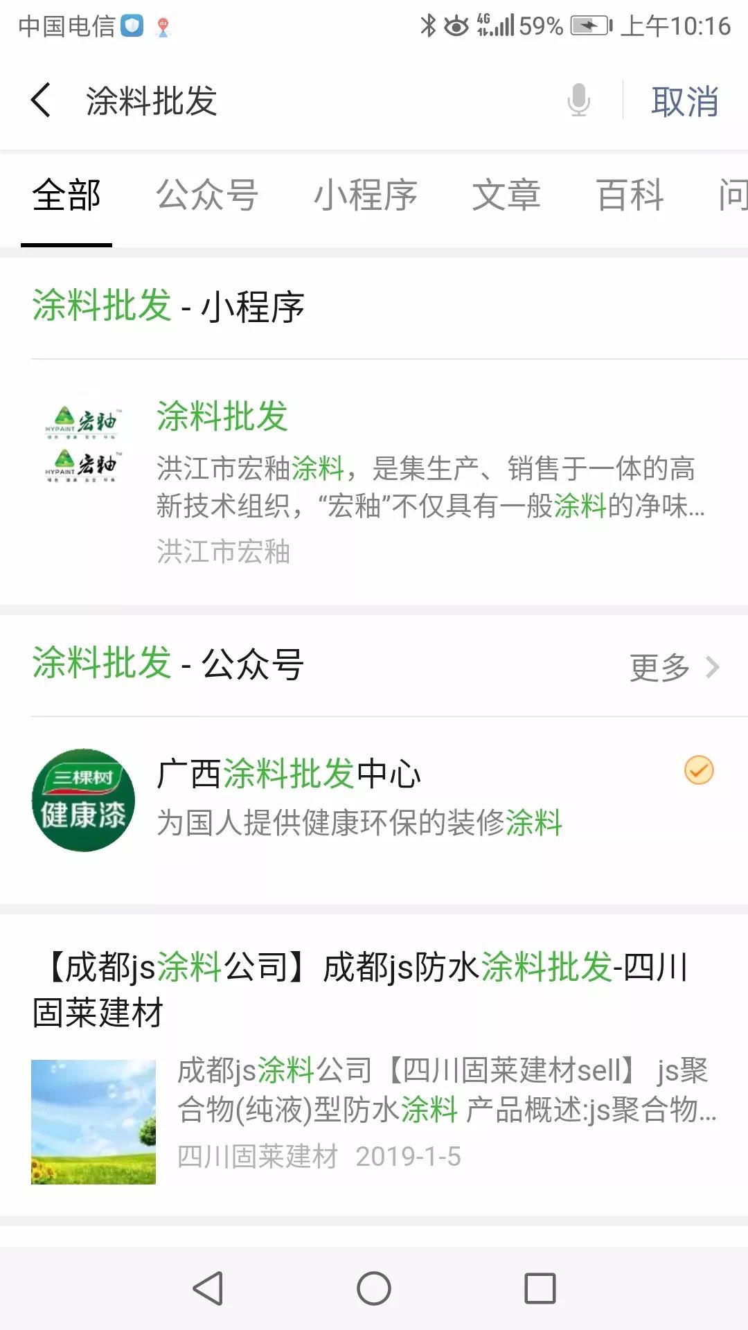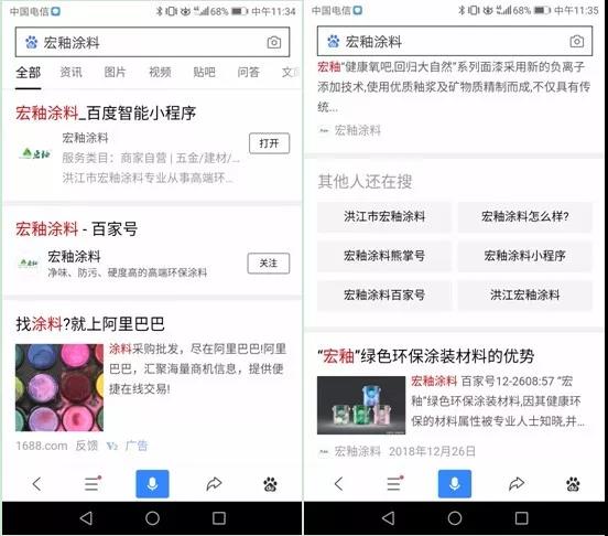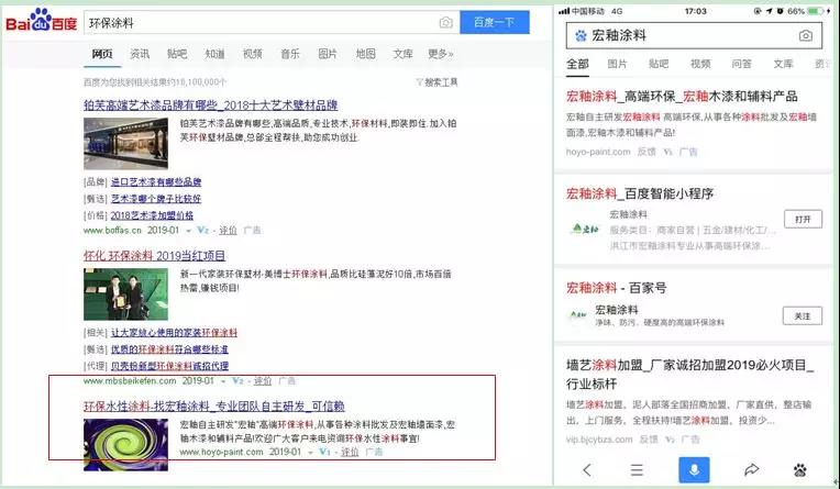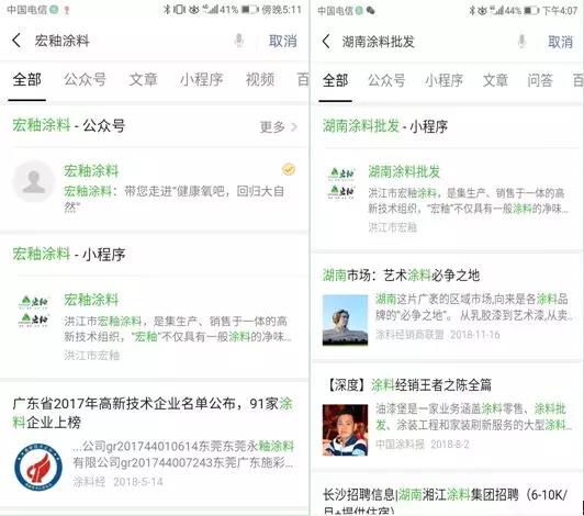 二是加強消費者對其產品的信任,消費者在百度、微信這兩個用戶量巨大的平臺上搜索“宏釉涂料”時,都可以出現官方網站。