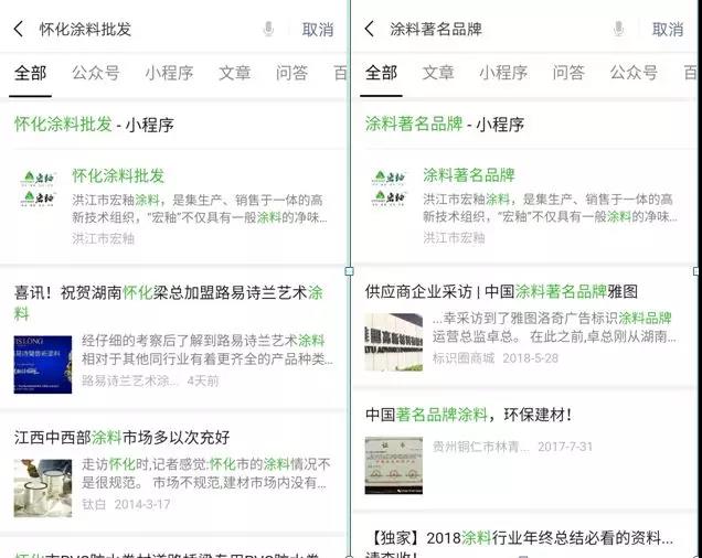 基于微信小程序名稱具有唯一性的特點,搶先注冊“宏釉涂料”小程序,利用微信小程序的排名規則,獲得“宏釉涂料”小程序的優先排名;同時搶注涂料批發、湖南涂料批發、懷化涂料批發、涂料著名品牌這四個行業名稱,均獲得優先排名,為品牌在微信APP里的曝光打好基礎。