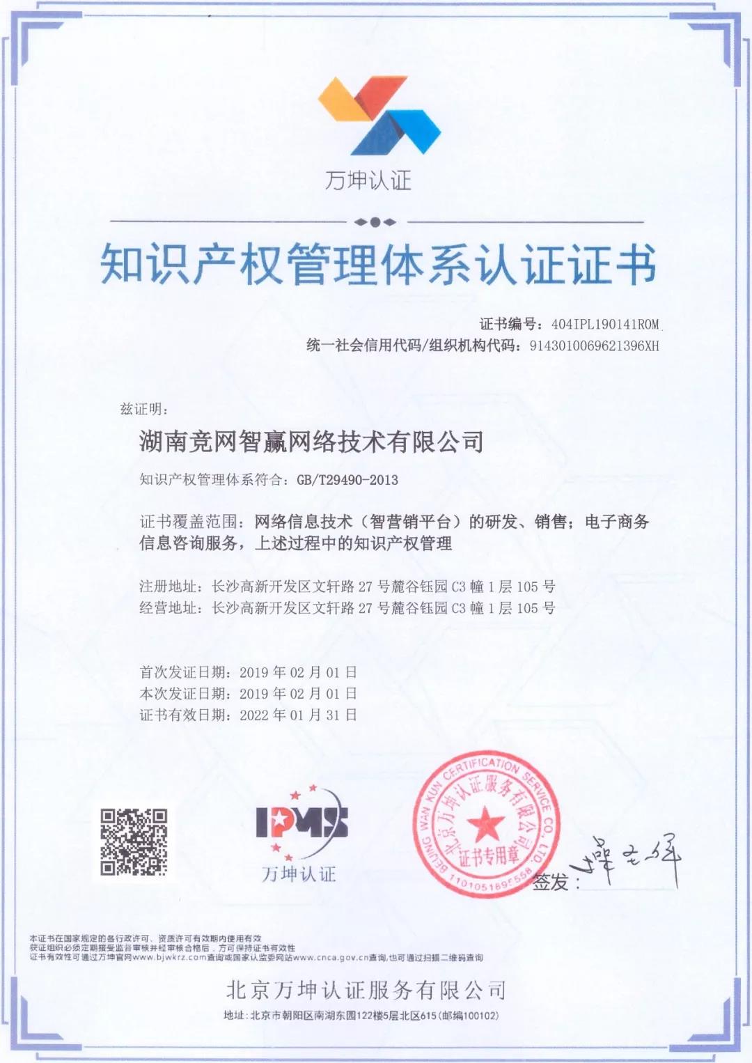為響應長沙市知識產權局“落實高質量發展要求,全力營造長沙良好的創新生態和營商環境”的號召,增強自身對知識產權的保護意識以及提升品牌價值,競網于2018年6月19日申請成為“長沙市企業知識產權管理規范化試點項目”的試點單位,2019年2月1日獲得北京萬坤認證服務有限公司專業機構認證的“知識產權管理體系認證證書”。