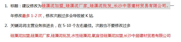 長沙中居建材貿易有限公司與競網建站客服周竟雄溝通時,反映搜索“長沙硅藻泥加盟”沒看到自己的網站,收到客戶的反饋信息后,競網建站周竟雄開始查看中居建材的網站收錄、打開速度、關鍵詞設置,經過一圈檢查下來, 結合對客戶信息的了解,周竟雄發現網站TDK設置不合理導致搜索關鍵詞搜索不到網站。對此,為方便客戶更好的理解,競網建站周竟雄專門為寫了一份診斷書。經過與客戶多次溝通,最終TDK確定修改為下圖的內容。