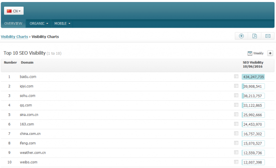 據(jù)Searchmetrics數(shù)據(jù)顯示,baidu.com這個域名的曝光度得分超過了4億,這是其他任何一個網(wǎng)站無法匹敵的。做個比較,在同一時間范圍內(nèi),美國維基百科wikipedia.org的曝光度得分僅為5000萬左右。