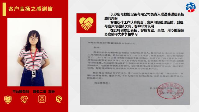 霜降雖至,陽(yáng)光依好,競(jìng)網(wǎng)建站微信群熱鬧非凡,被一封來(lái)自長(zhǎng)沙創(chuàng)電數(shù)控設(shè)備有限公司(以下簡(jiǎn)稱長(zhǎng)沙創(chuàng)電數(shù)控)的感謝信刷爆了,競(jìng)網(wǎng)建站客服馮盼憑借高效溝通、專(zhuān)業(yè)服務(wù)獲得了大伙兒一致點(diǎn)贊。